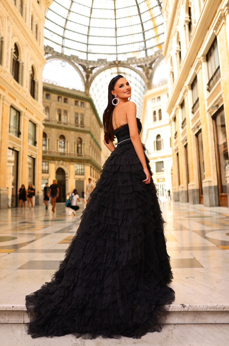 NC1047 by Australian Designer Nicoletta is available in sizes 4-18 in Purple, Navy, & Black. Strapless Sweetheart Neckline with Ruffle Detail