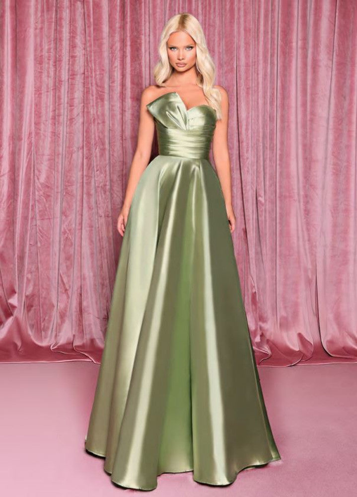 This strapless beauty flaunts an asymmetrical sweetheart neckline and a structured bodice with built-in padding for a perfect fit.